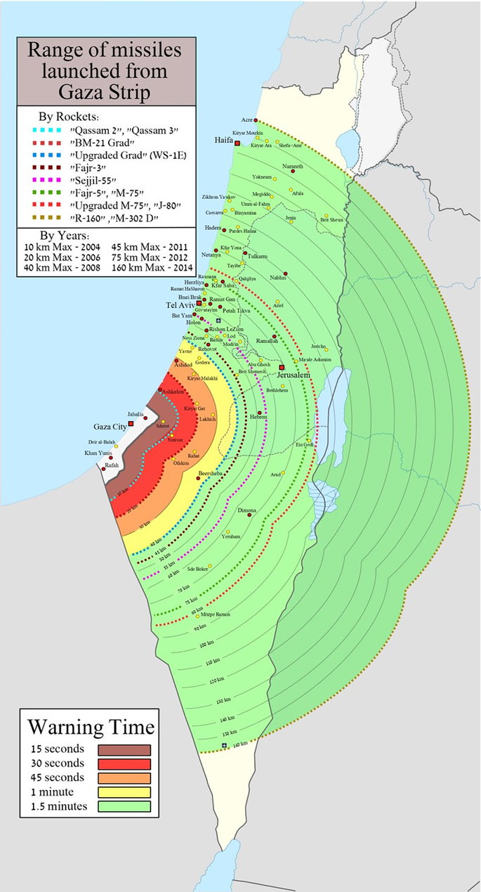a une portée de 250 km. La portée des plus grosses roquettes du Jihad